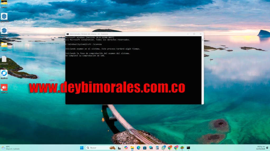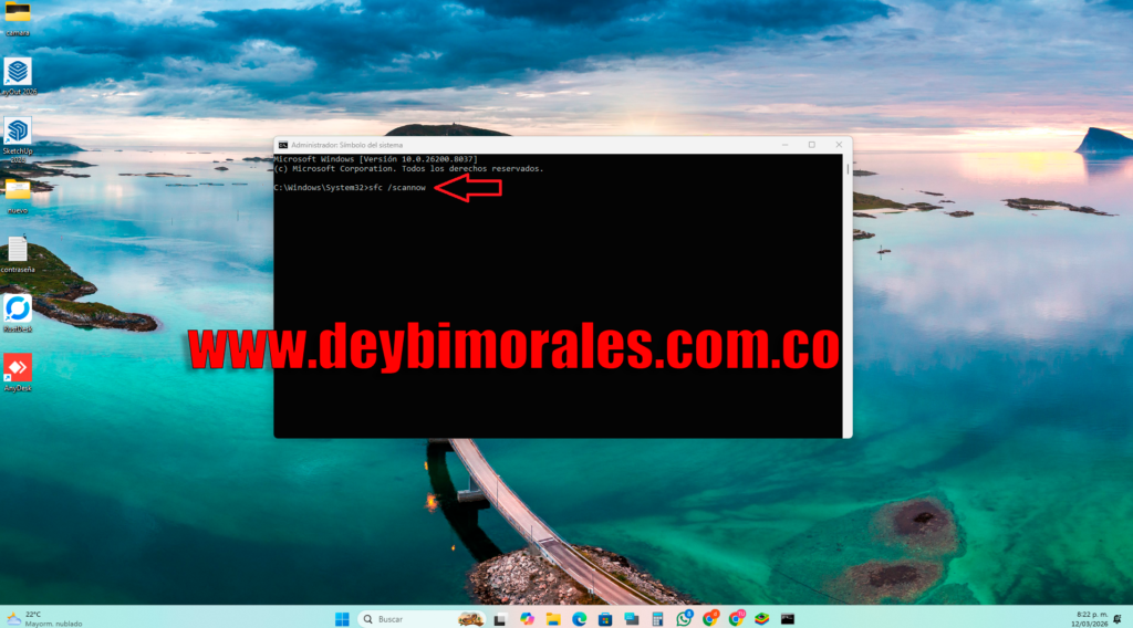 2. escribir sfc /scannow y presionar enter, empezara a hacer un proceso, dejar terminar